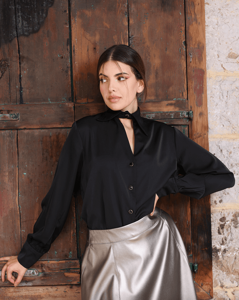 Collar Cut Out Blouse - Black / Small is backordered and will ship as soon as it is back in stock.