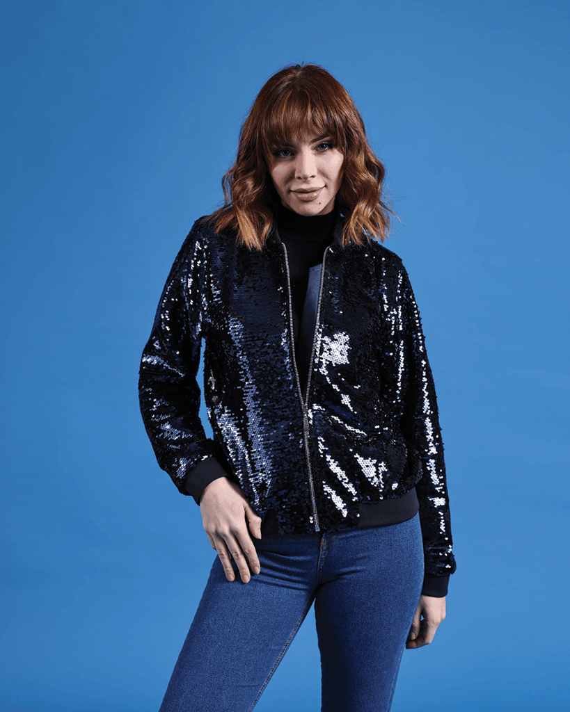 Bomber jacket featuring a round collar and long sleeves. Metal zip fastening at the front.