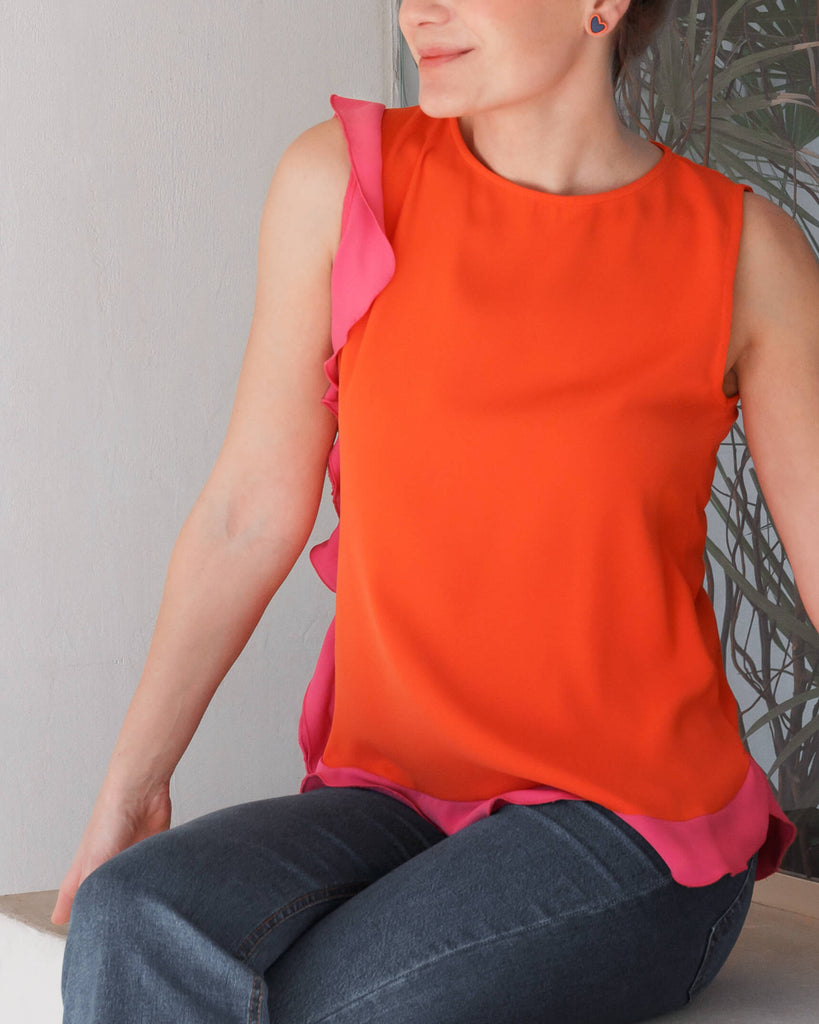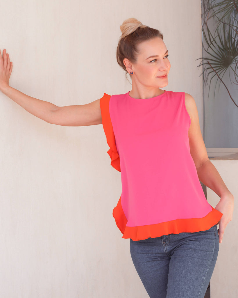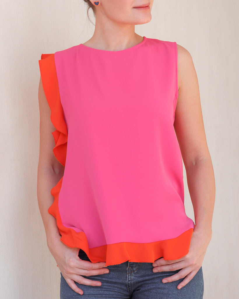 Sleeveless Color Block Top with contrasting ruffle details along one shoulder and the hem.